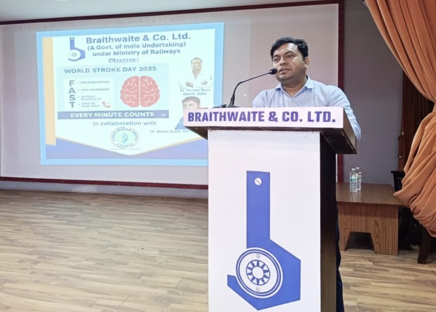 29 अक्टूबर 2025 को “विश्व स्ट्रोक दिवस” के अवसर पर ब्रेथवेट एंड कंपनी लिमिटेड (बीसीएल) में एक स्वास्थ्य जागरूकता संगोष्ठी का आयोजन किया गया। यह कार्यक्रम नारायण मेमोरियल हॉस्पिटल, बेहाला, कोलकाता के सहयोग से आयोजित किया गया। इस संगोष्ठी का उद्देश्य कर्मचारियों में “स्ट्रोक” — उसके कारणों, लक्षणों और बचाव के उपायों — के प्रति जागरूकता फैलाना था।कार्यक्रम में शहर के दो प्रख्यात चिकित्सक — डॉ. सौरव बसु और डॉ. अर्पण दत्ता — मुख्य वक्ता के रूप में उपस्थित रहे। अतिथियों का स्वागत श्री आर. वीराबाहु, निदेशक (वित्त), बीसीएल द्वारा सादर किया गया।अपने स्वागत भाषण में श्री वीराबाहु ने ऐसे स्वास्थ्य दिवसों के महत्व पर प्रकाश डालते हुए कहा कि ये दिवस हमें संतुलित और स्वस्थ जीवन जीने की प्रेरणा देते हैं।