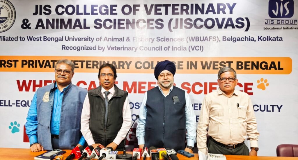 Kolkata, 14th November 2025: JIS Group announced the launch of West Bengal’s first private veterinary college, “JIS College of Veterinary & Animal Sciences” (JISCOVAS), spread over 30 acres in Mogra, Hooghly, at a press conference in Kolkata. Dignitaries including Sardar Taranjit Singh, Managing Director, Dr. Promit K Ghosal, Project Coordinator, JISCOVAS, Prof. (Dr.) Mozammel Hoque, Principal, JIS College of Veterinary and Animal Sciences, Shri. Bidyut Majumder, Deputy Director, Business Development, JIS Group and senior officials of JIS Group & JISCOVAS were present on the occasion.